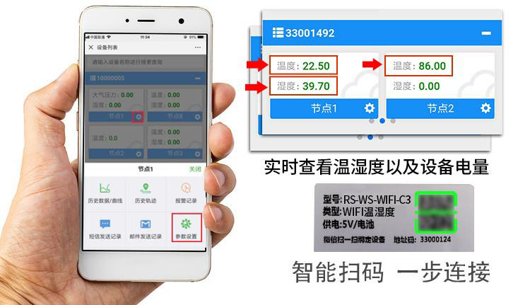 微信平臺遠程監控可以為用戶提供更好的使用體驗。首先要注意“山東設備平臺”的公開號碼,選擇【添加設備】按鈕,點擊【識別設備】,在WIFI型溫濕度變送器上掃描二維碼,設備綁定成功。設備綁定完成后,我們可以通過【主機參數配置】編輯變送器的名稱,設置數據的上限和下限,離線判斷時間間隔,短信報警間隔,添加管理人員信息等。其次,通過“山東任可設備平臺”微信公眾號,可以隨時查看監控場所的實時溫濕度數據和設備的剩余電量,實現遠程監控。